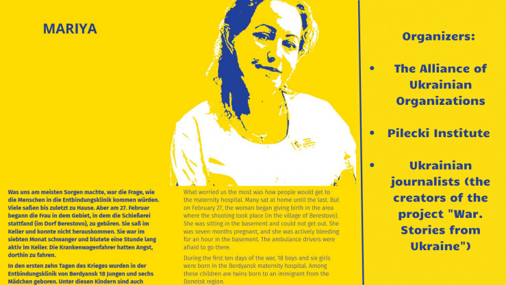 Die Allianz Ukrainischer Organisationen*, das Pilecki-Institut und eine Gruppe ukrainischer Journalisten (die das Projekt "Krieg. Geschichten aus der Ukraine"* ins Leben gerufen haben) organisieren die Ausstellung "Stimmen der Ukraine". Die Ausstellung ist den Geschichten von Ukrainern gewidmet, deren Leben sich am 24. Februar durch den Ausbruch des Krieges vollkommen verändert hat. Sie wird vom 16. März bis zum 13. April am Pariser Platz 4A, 10117 Berlin, zu sehen sein.