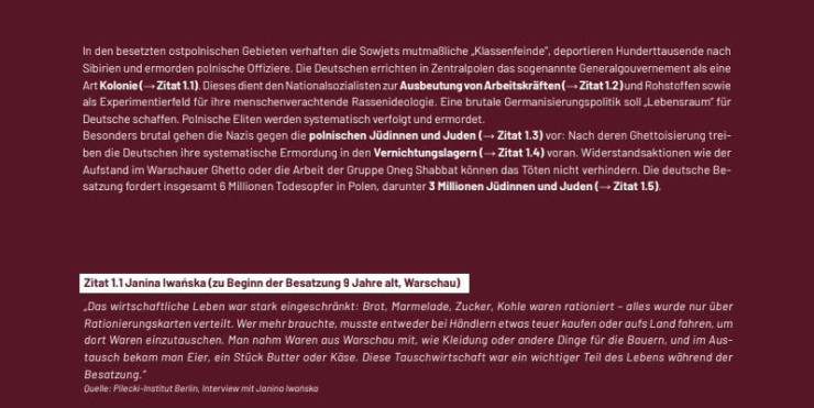 Die Schülerinnen und Schüler der gymnasialen Oberstufe haben das Kriegsende aus der Perspektive polnischer Zeitzeug:innen und Quellen erforscht und sichtbar gemacht. Grundlage der Ausstellung sind persönliche Berichte von Überlebenden des Zweiten Weltkriegs aus den archivalischen Sammlungen Chronicles of Terror des Pilecki-Instituts und des Fortunoff Archive der Yale University sowie Interviews mit Zeitzeug:innen, ergänzt durch Fotos aus der Bildersammlung des Bundesarchivs.
