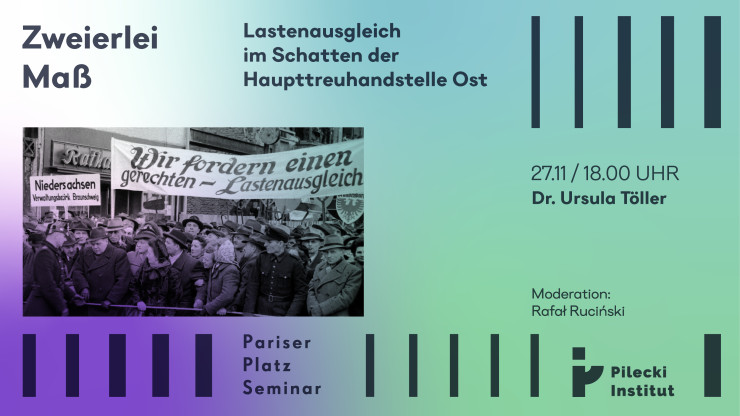 Das Pilecki-Institut Berlin lädt Sie herzlich zur Buchpräsentation von „Zweierlei Maß. Lastenausgleich im Schatten der Haupttreuhandstelle Ost“ ein. Die Veranstaltung findet am Montag, den 27. November 2024, um 18:00 Uhr in den Räumlichkeiten des Instituts statt. Zu Gast sind die Autorin des Buchs, Dr. Ursula Töller, und Rafał Ruciński, Leiter der Archivabteilung des Pilecki-Instituts Berlin.