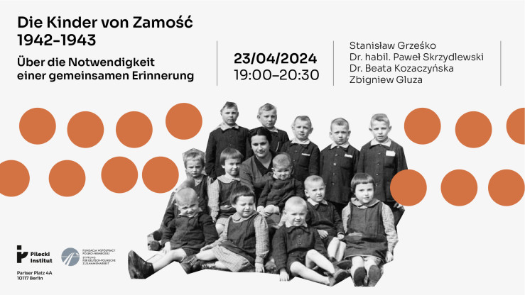 In den Jahren 1942-1943 vertrieben die deutschen Besatzer fast 110.000 Polen aus der Region Zamość / Zamojszczyzna. Darunter waren 30.000 Kinder von denen etwa 5.000 der Germanisierung unterworfen waren und anschließend nach Deutschland geschickt wurden. Diese Veranstaltung dient der Vorstellung der aktuellen Gedenkprojekte für die Opfer der „Aktion Zamość", für die wir das Interesse und die Mitarbeit deutscher Partner gewinnen wollen. Der Landrat von Zamość, Stanisław Grześko, wird zusammen mit Paweł Skrzydlewski (Akademia Zamojska) die Idee zur Gründung des Museums der Kinder von Zamość vorstellen. Zbigniew Gluza (Stiftung Ośrodek Karta aus Warszawa) wird ein Projekt zur Veröffentlichung von Fragmenten der Memoiren von Zbigniew Klukowski über die deutsche Besetzung der Region Zamojszczyzna in den Jahren 1939-1945 auf Deutsch vorstellen. Dr. Beata Kozaczyńska, die an der Universität Siedlce über Besatzung in der Region Zamość forscht, wird den historischen Kontext und statistische Daten vorstellen.