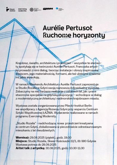 Im Rahmen des Weekend Architektury in Gdynia präsentiert die französische Künstlerin Aurélie Pertusot ihre Ausstellung „Ruchome horyzonty“ (dt. Verschiebbare Horizonte) im neu eröffneten Studio Rozalia in Gdynia. Die Installationen und Arbeiten der in Berlin und Nancy lebenden Künstlerin treten in einen sensiblen Dialog mit der modernistischen Architektur und dem maritimen Landschaftsraum der Stadt. Pertusots Werke erforschen das Spannungsfeld zwischen Licht, Raum und Materialität – und eröffnen neue Perspektiven auf die Verbindung von Kunst und Umgebung.