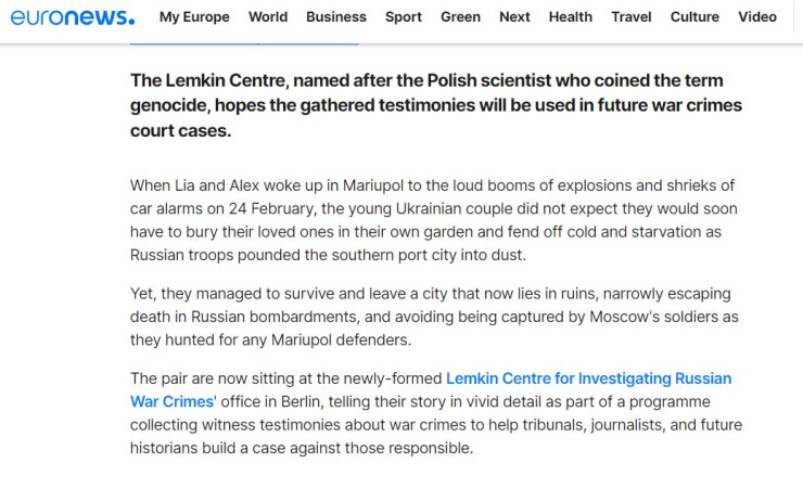 Seit Ausbruch der russischen Kriegseskalation gegen die Ukraine sammelt das "Raphael-Lemkin-Zentrum für die Dokumentation von russischen Verbrechen in der Ukraine" Zeugenaussagen und Berichte ukrainischer Zivilisten und Militärangehöriger, um Beweise für von russischen Truppen begangene Kriegsverbrechen zu sichern.