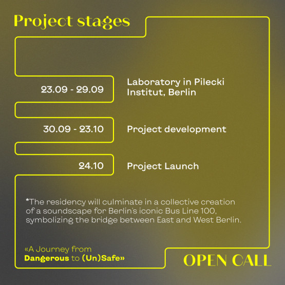 Thus, artists will synthesize their insights and experiences to create a special soundscape for Berlin’s bus line number 100. This iconic route serves as a symbolic bridge between the East and West parts of the city, empowering the city’s complex history memory, echoing the connection between critical infrastructures of Eastern and Western Europe and human experiences of belonging or not belonging to the place. Through narrative exploration, the audio production will illuminate themes of human stories, refugee dis/integration, and the pursuit of belonging amidst uncertainty and displacement. Artists will explore and reinterpret Berlin’s prominent historical city locations through Bus Line 100 and discover the periphery, nooks, and cranes connected by bus stops.