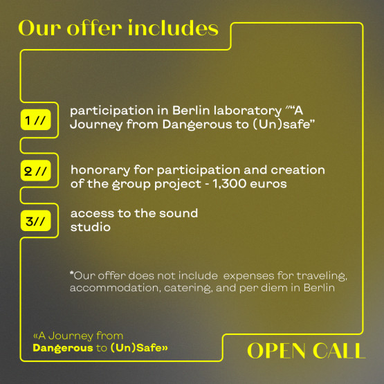 The project’s concept, “A Journey from Dangerous to (Un)Safe,” comprises a Laboratory residency in Berlin with a week-long embodied practice, followed by three weeks of group artistic work on project delivery.