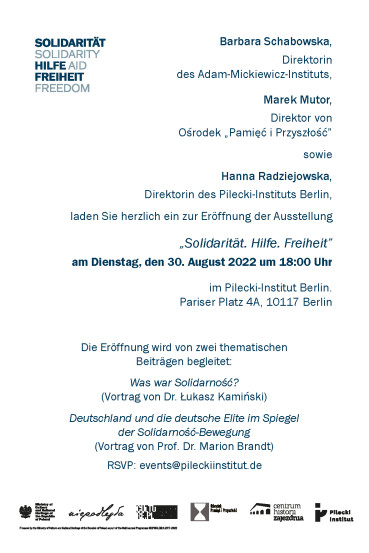Die Eröffnung wird von zwei thematischen Beiträgen begleitet: Der Kurator der Ausstellung Dr Łukasz Kamiński wird eine Einführung in die Geschichte der Solidarność vortragen, während Prof. Dr. Marion Brandt sich mit den deutschen Reaktionen auf die Solidarność auseinandersetzen wird.