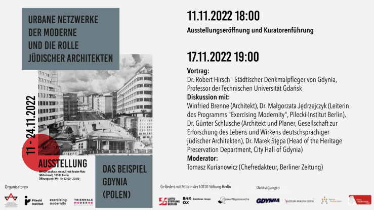 Die Ausstellung „Urbane Netzwerke der Moderne und die Rolle jüdischer Architekten – Das Beispiel Gdynia (Polen)“ berichtet über die Architektur von Gdynia aus der Zwischenkriegszeit anhand von ausgewählten Realisierungen von Architekten jüdischer Herkunft. Sie waren in der Zwischenkriegszeit eine wichtige Gruppe von Künstlern, die an den Modernisierungsprojekten für den Wiederaufbau und die Neugestaltung des Landes beteiligt waren, und sie trugen aktiv zur Entwicklung der modernen Architektursprache bei.