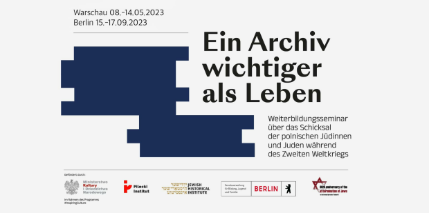 Auch dieses Jahr organisiert das Pilecki-Institut Berlin in Kooperation mit dem Jüdischen Historischen Institut Warschau und der Senatsverwaltung für Bildung, Jugend und Familie das zweiteilige Weiterbildungsseminar "Ein Archiv wichtiger als Leben". Das Projekt wird vom Ministerium für Kultur und Nationales Erbe der Republik Polen im Rahmen des Programms "Inspirierende Kultur" für 2022-2023 gefördert. Es richtet sich an Lehrkräfte in Schulen und Multiplikator:innen der außerschulischen Bildungsarbeit.