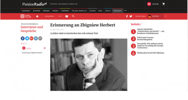 In einem Radiobeitrag (https://www.polskieradio.pl/.../2780028,Erinnerung-an...) machen Magda Dercz und der Literaturübersetzer Andrzej Dercz auch auf die interessanten Deutschlandbezüge in Herberts Schaffen aufmerksam. Deutsch soll die zweite Sprache in seiner Familie gewesen sein und er selbst war einer jener polnischen Dichter und Autoren, die im deutschen Sprachraum neben Różewicz besonders intensiv wahrgenommen und rezipiert wurden. 1968 zog Herbert nach Berlin, wo er nur relativ kurz verweilte. Ende der 1970er Jahre zog es ihn aber wieder nach Deutschland und Österreich. Seit 1974 war er Mitglied der Akademie der Künste, er gewann auch den Petrarca-Preis und den Preis der Stadt Münster für Europäische Poesie.