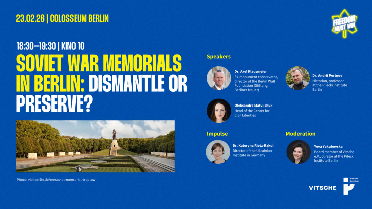 The conversation will open with a keynote by Oleksandra Matviichuk, Head of the Center for Civil Liberties and Nobel Peace Prize laureate (2022), framing memory as a central element of transitional justice. The panel brings together Dr. Andrii Portnov, expert in memory studies and post-Soviet history, and Dr. Christoph Rauhut, State Conservator, Berlin State Office for the Preservation of Monuments, to discuss preservation, reinterpretation, and possible transformation of Soviet memorials in Berlin. The discussion will be moderated by Yeva Yakubovska, a board member of Vitsche e.V. and a curator at the Pilecki Institute Berlin.