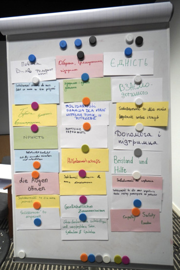 Dabei waren Jugendliche aus Lviv, Wolfsburg und Oświęcim, die im Rahmen des Projektes „Lichter in der Dunkelheit. Solidarität“ (Polnisch Światło w ciemności. Solidarność, Ukrainisch Світло у темряві. Солідарність) an unserem Workshop zur Geschichte der polnischen Solidarność-Bewegung teilgenommen haben. Für unsere Bildungsabteilung war es zunächst eine Herausforderung: einen Workshop in vier Sprachen (Deutsch, Polnisch, Ukrainisch und dazu noch Englisch als lingua franca) haben wir noch nie durchgeführt. Aber dank der Unterstützung der Sprachmittlerinnen, die die Gruppe begleitet haben, wurde die Sprachbarriere rasch überwunden.